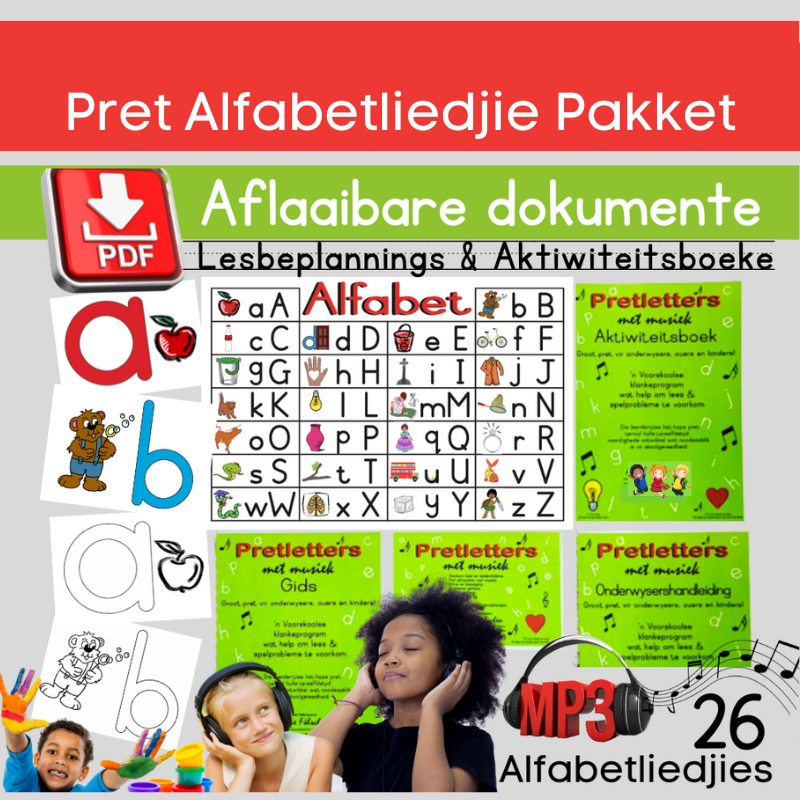 Met die Pretletters Volledige Pakket kry jy alles wat jy nodig het in een praktiese aflaai β geen intekeninge, geen voorbereidingstress, net leer met musiek en plesier