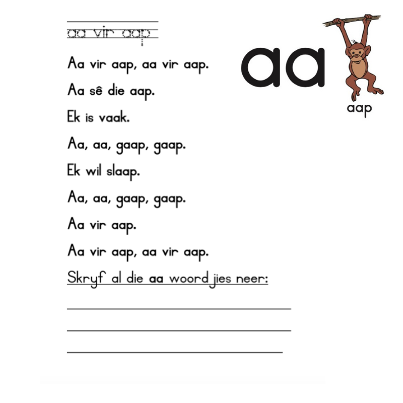 Hierdie aflaaibare werkboek is spesiaal ontwerp om dubbelklanke en diftonge op 'n prettige, sistematiese manier aan te leer, vas te lê en te hersien. Dit is ideaal vir gebruik in die Grondslagfase (Graad R tot Graad 3) en as deel van leerondersteuning of tuisonderrig.